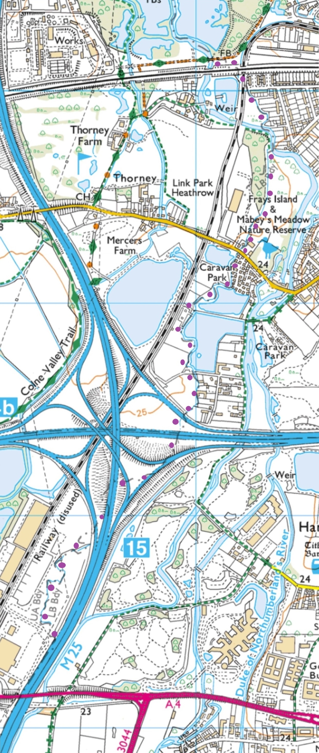 Apart from the start on the Colne Valley Permissive Bridleway, a short stretch of the River Colne using Iver FP21, Thorney Mill Road bridge, and Harmondsworth Moor Country Park, little of the Bigley Ditch is publicly accessible.