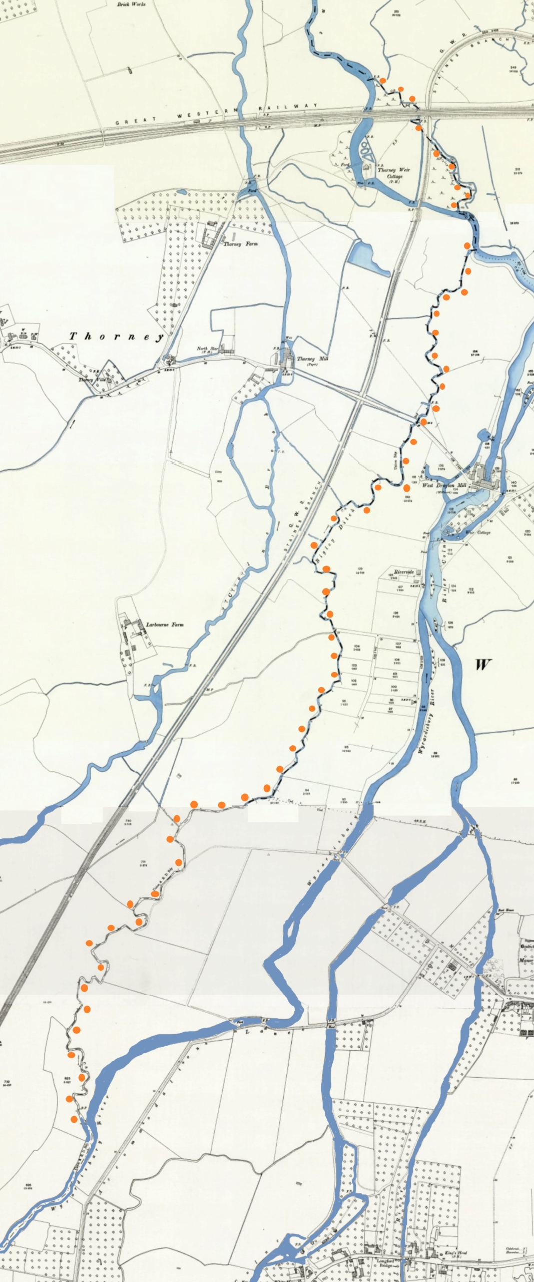 Although the original course of the Bigley Ditch still marks the county boundary, there are many places where the river itself has been moved. This is because of the building of the Iver Water Works Road, the main Paddington railway line, the Link Park industrial site west of Mabey’s Meadow, the M4 and the M25.